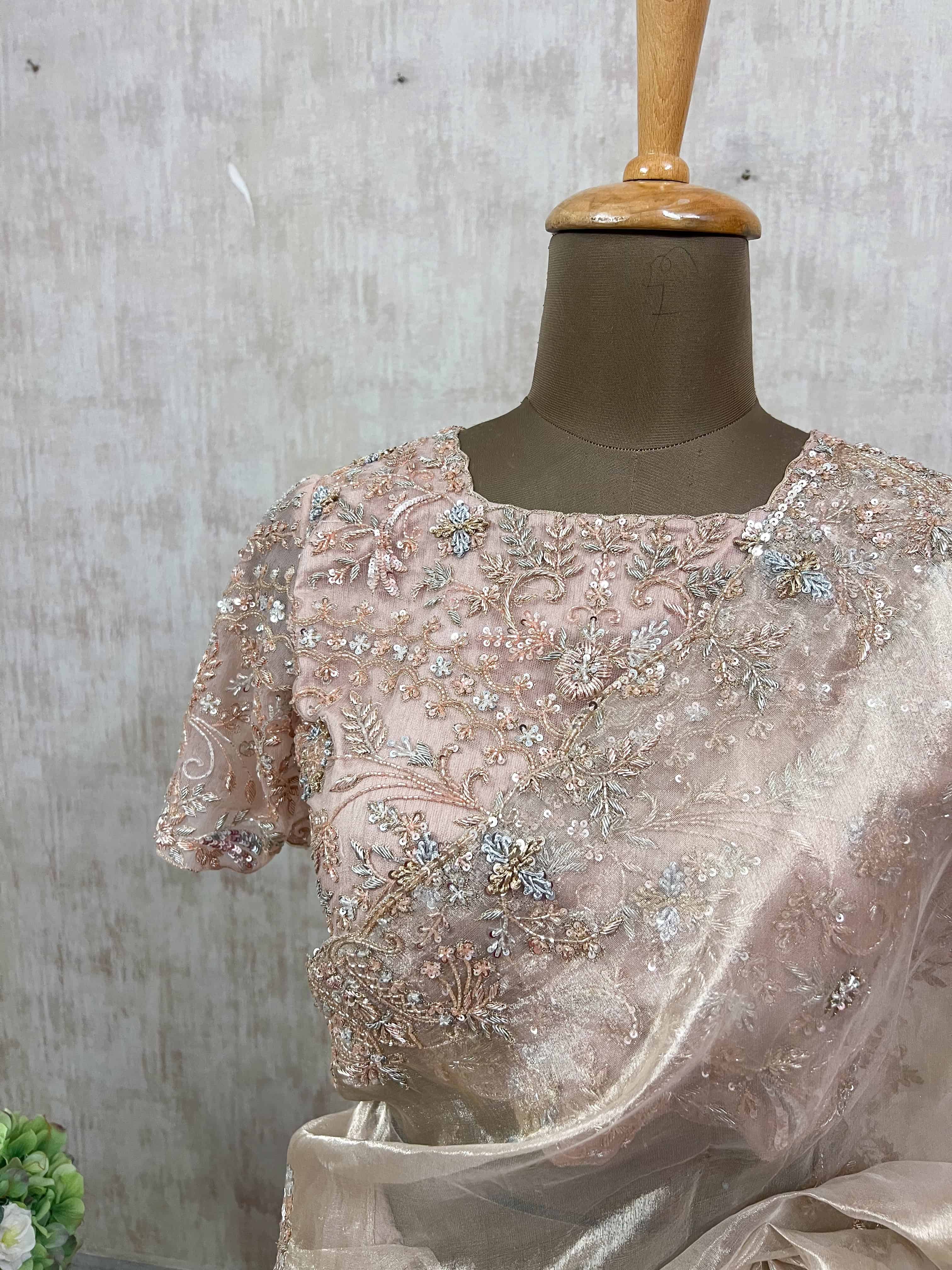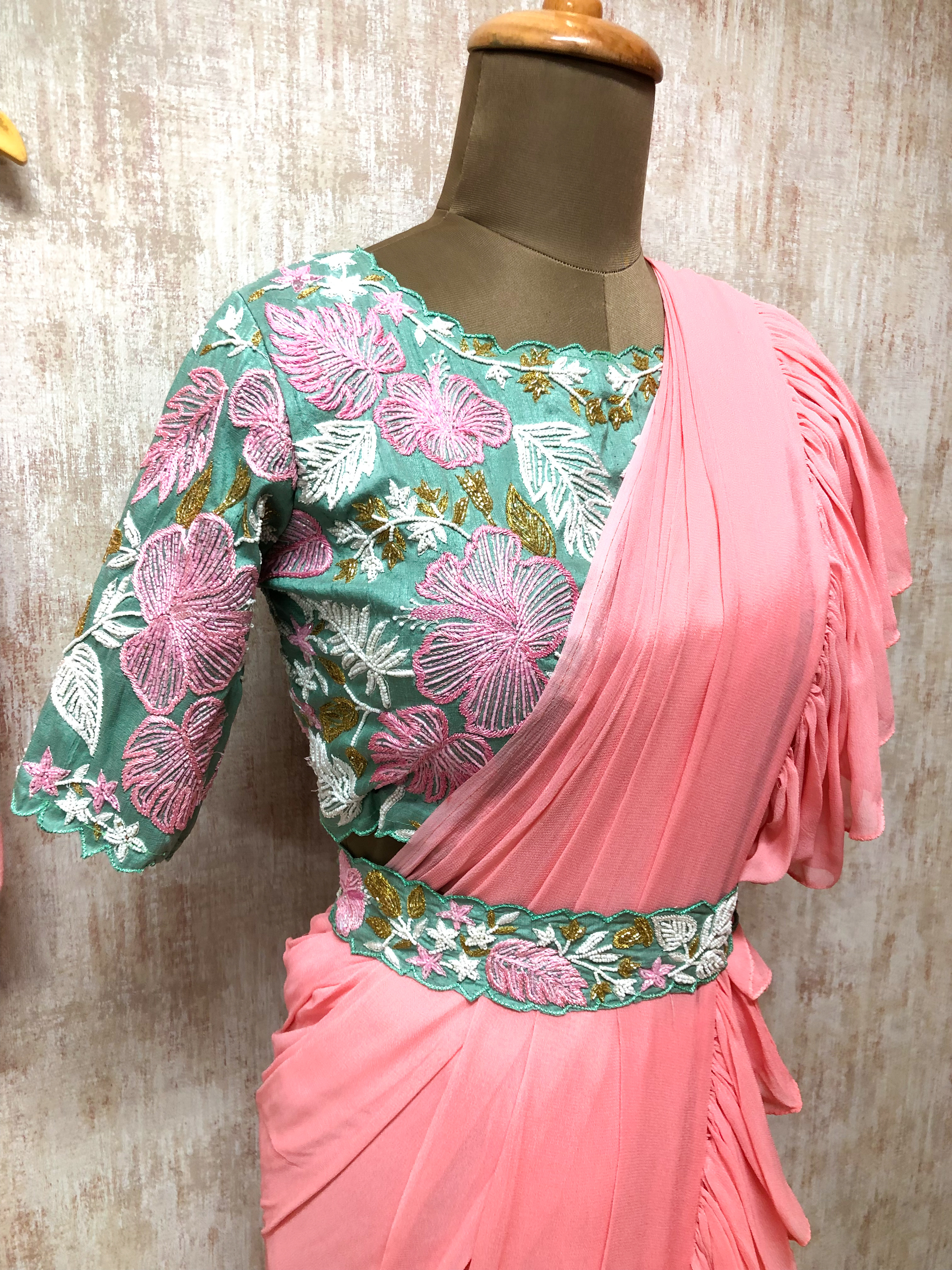 Pastel Pink Ruffle Saree with Embroidered Floral Blouse