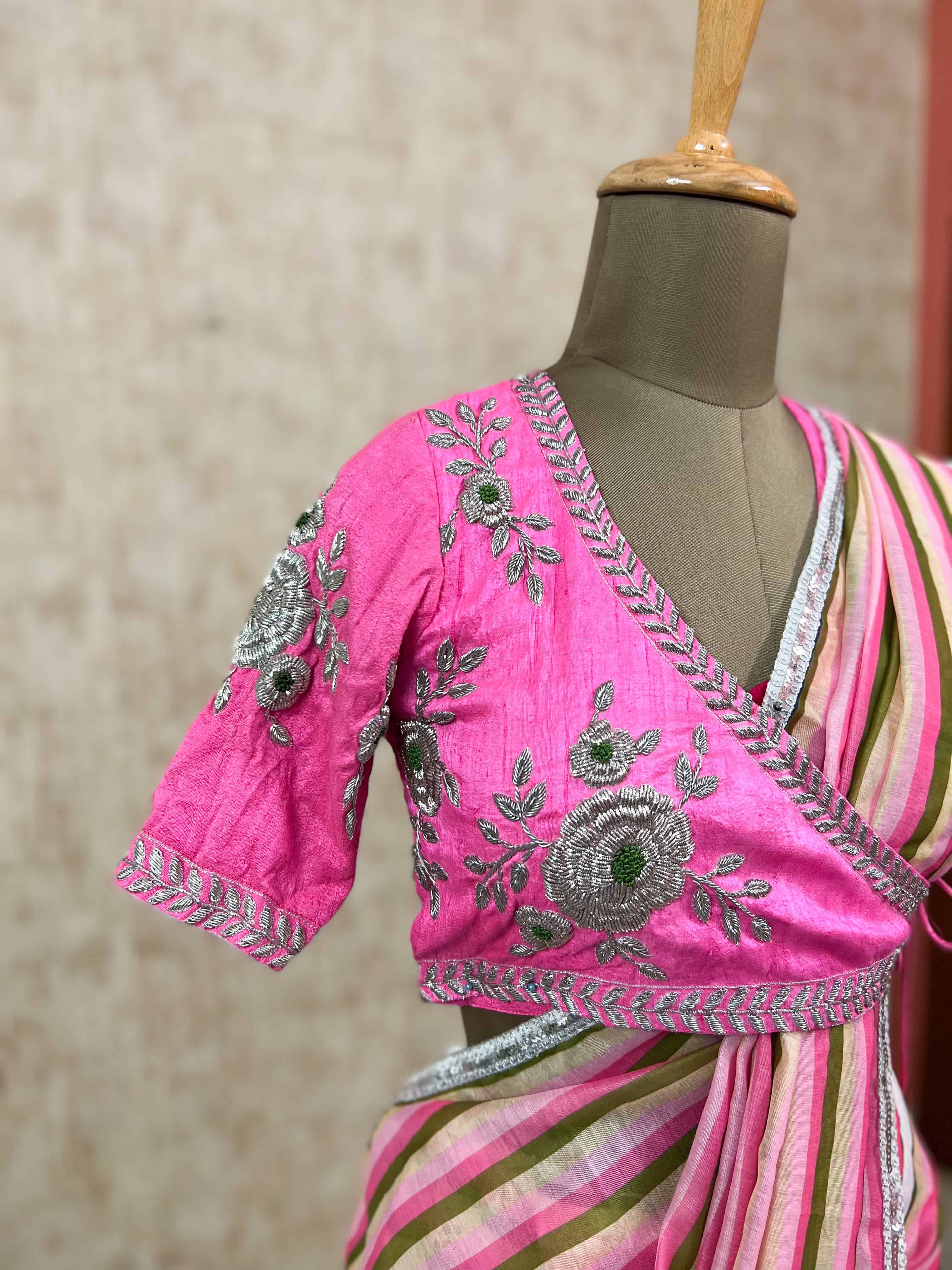 Pink Striped Saree with Embroidered Blouse