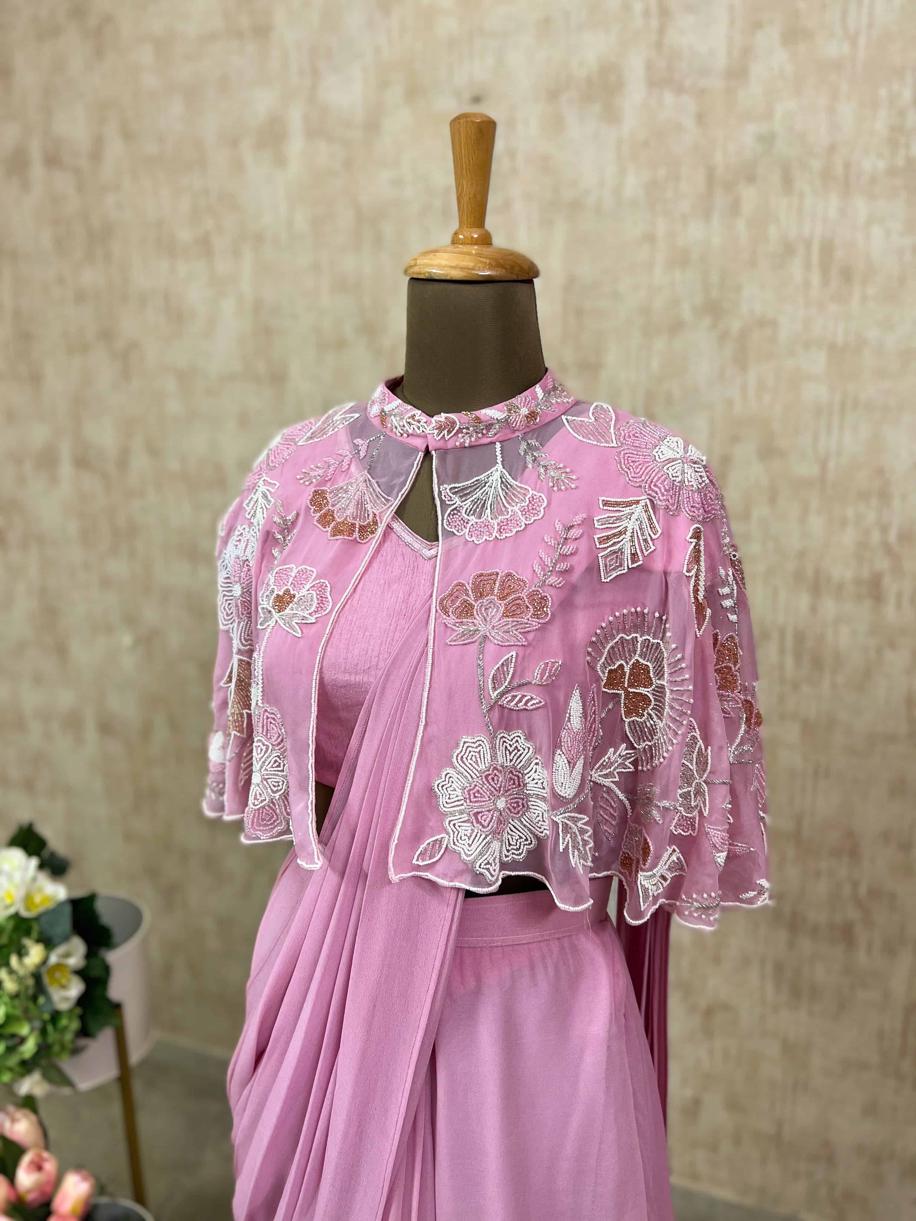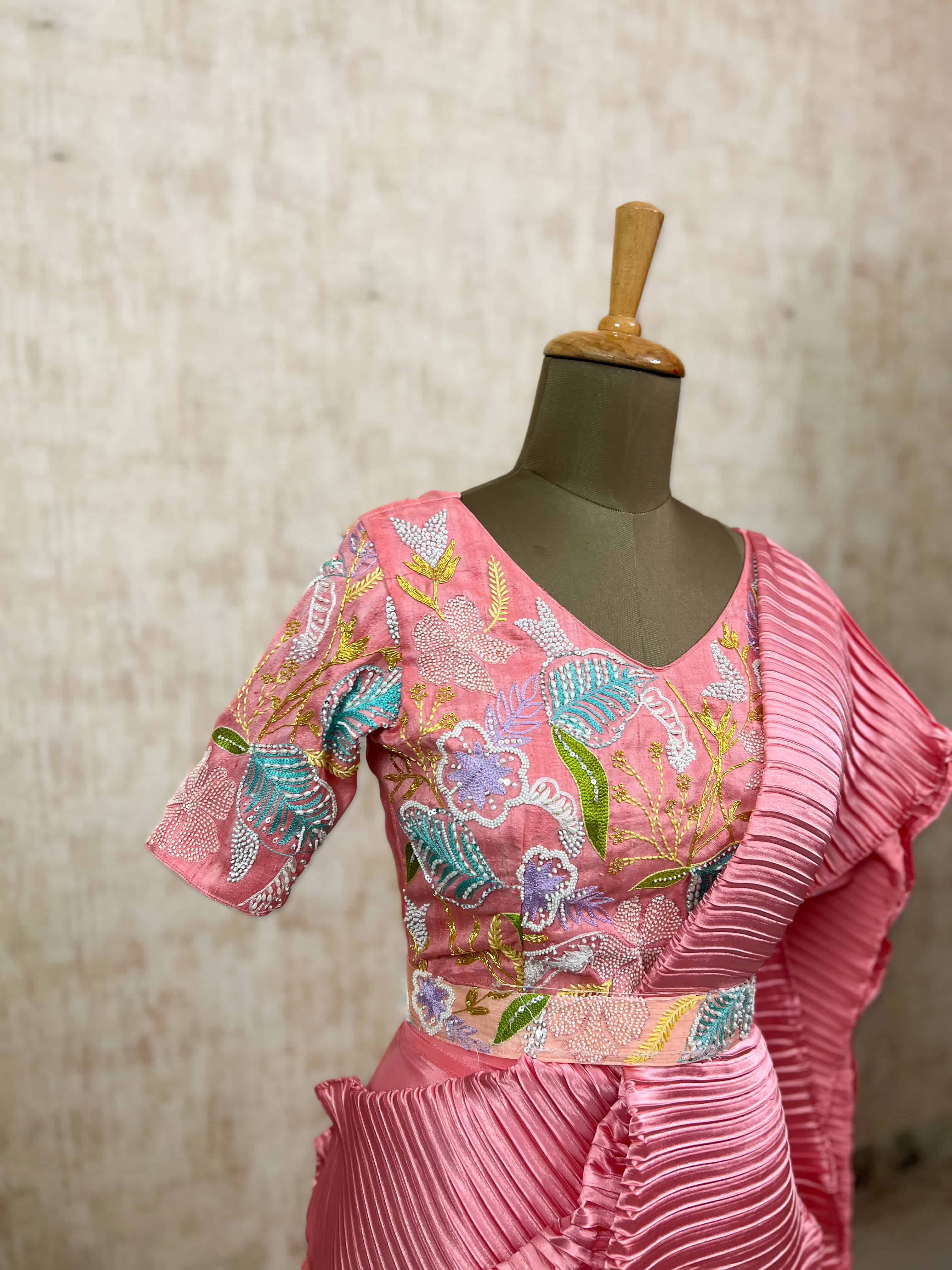 Pink Pleated Saree with Embroidered Blouse