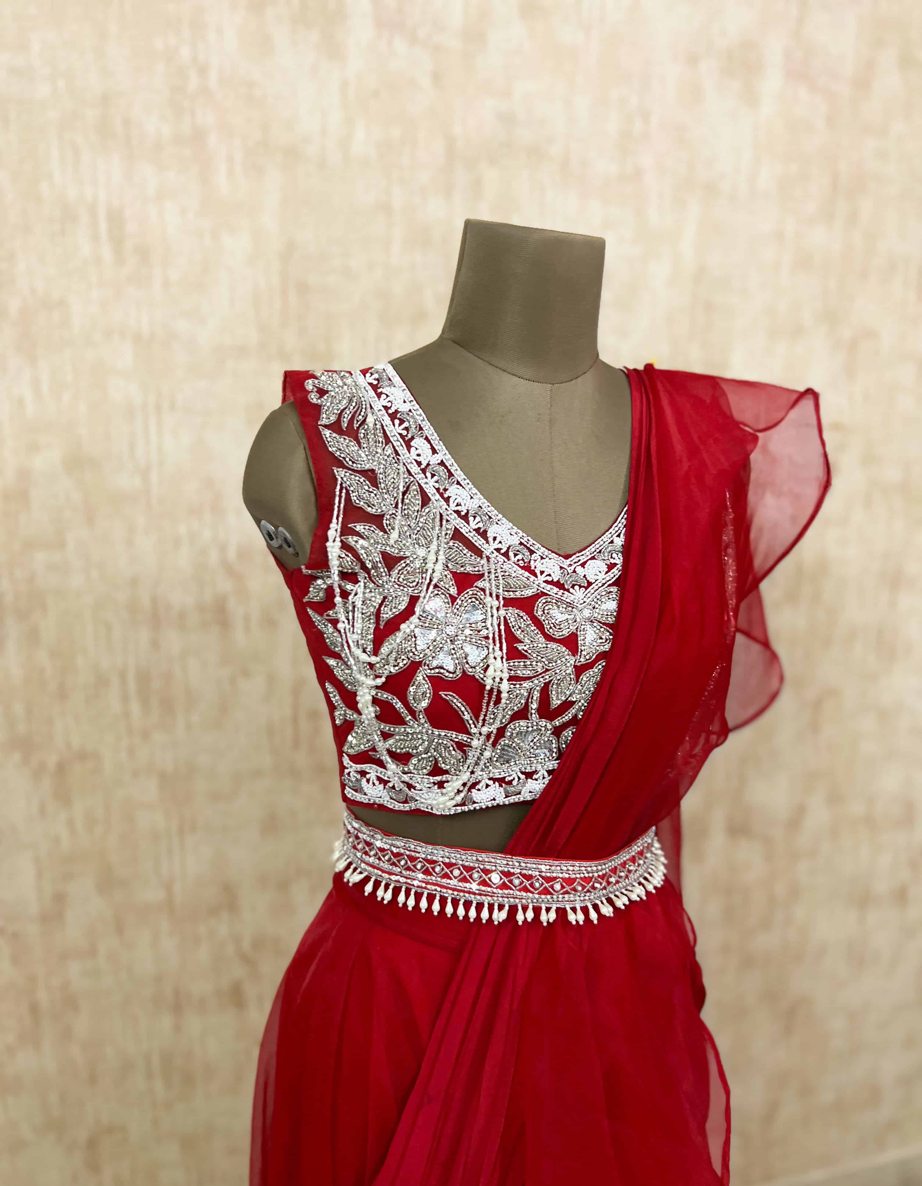 Radiant Red Sequin Blouse with Ruffled Saree Set