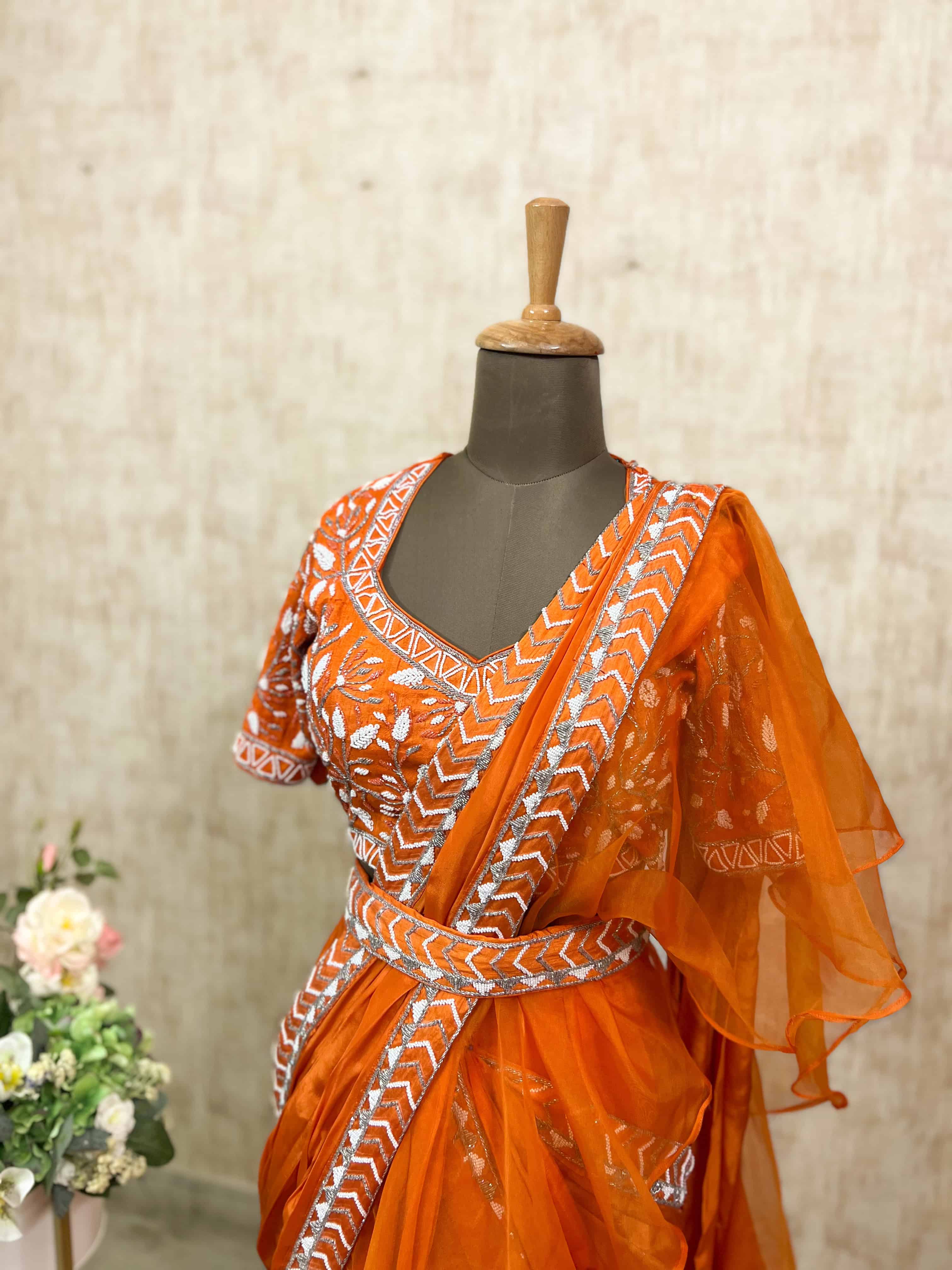 • Vibrant Orange Ruffled Saree Set