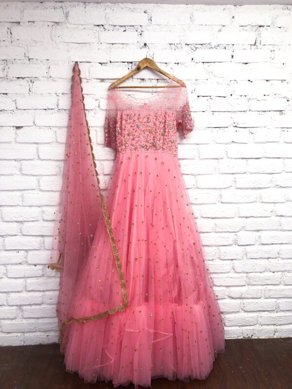 Hand embroidered bodice with net flared gown paired with net dupatta(Can be customized as per your requirement.)