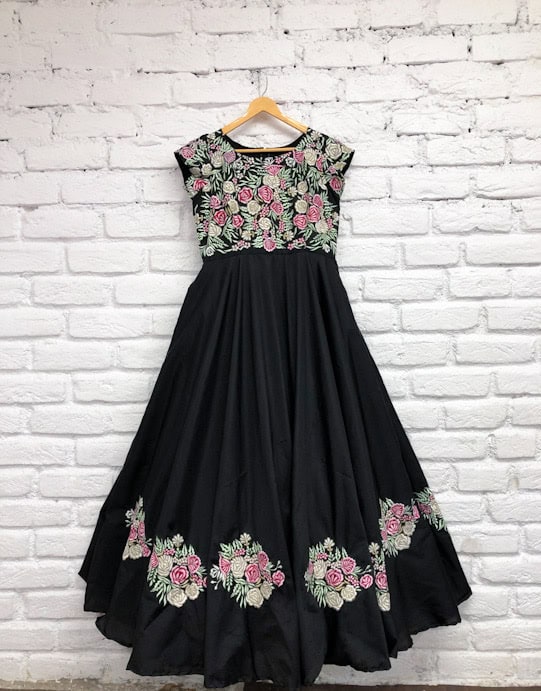 This combination of bold color and intricate detailing makes the gown a statement piece, perfect for evening affairs or formal events where sophistication meets artistic flair. (Can be customized as per your requirement.)