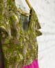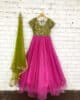 A pink and green combo dress with a hand-worked bodice blends elegance with vibrant contrast. The bodice, meticulously adorned with intricate handcrafted designs, serves as the focal point, featuring delicate stitches and embellishments that highlight the craftsmanship (Can be customized as per your requirement.)
