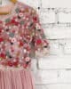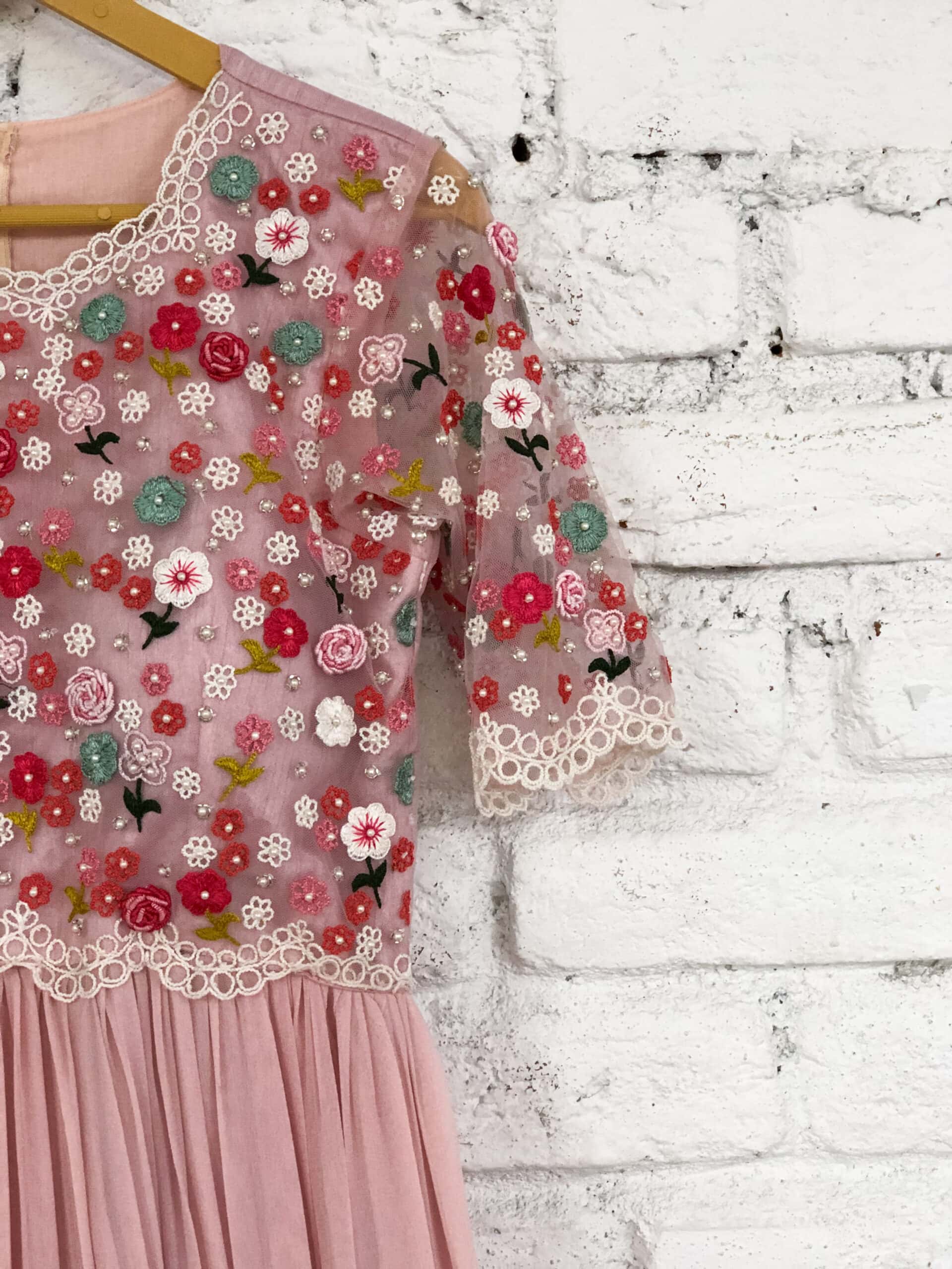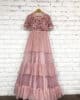 This gown features tiers that add depth and dimension to its design.The bodice of the gown are adorned with floral embroidery. The floral design add a touch of nature-inspired beauty and whimsy, elevating the gown’s aesthetic with a sense of artistry and charm.