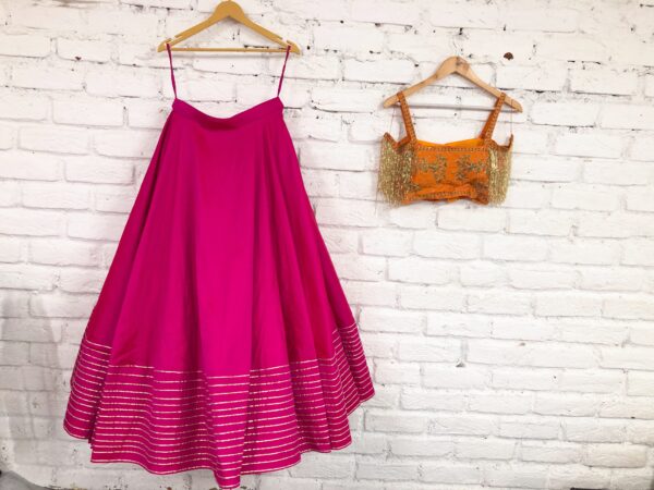 This striking rani pink lehenga exudes vibrancy and elegance, perfectly complemented by an intricately designed orange beadwork blouse. The blouse features charming bead tassels on the sleeves, adding a playful touch to the overall look