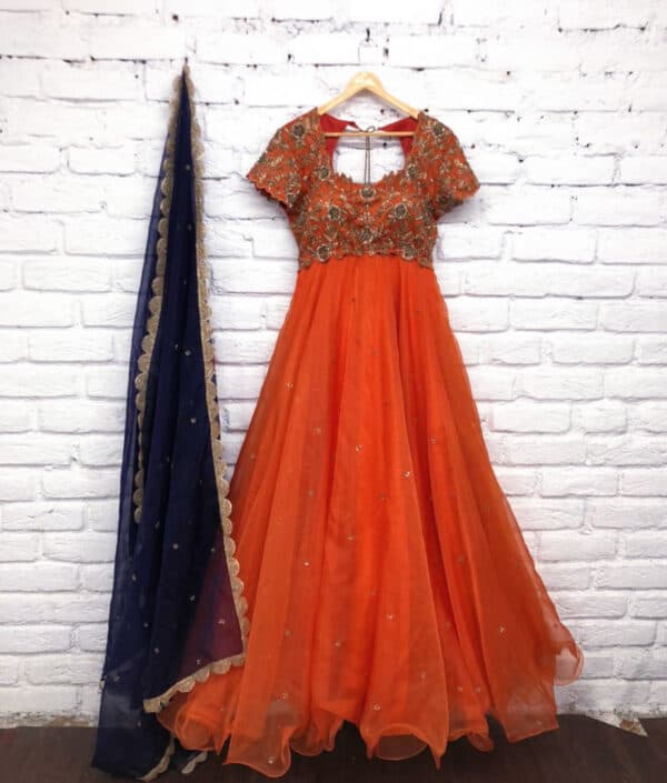 The bodice of this gown is adorned with zardozi embroidery, which adds a luxurious texture and visual depth. The shimmering metallic threads enhance the gown’s allure, creating a dazzling effect that catches the light. This orange gown is paired with lovely navy bluej,. dupatta.