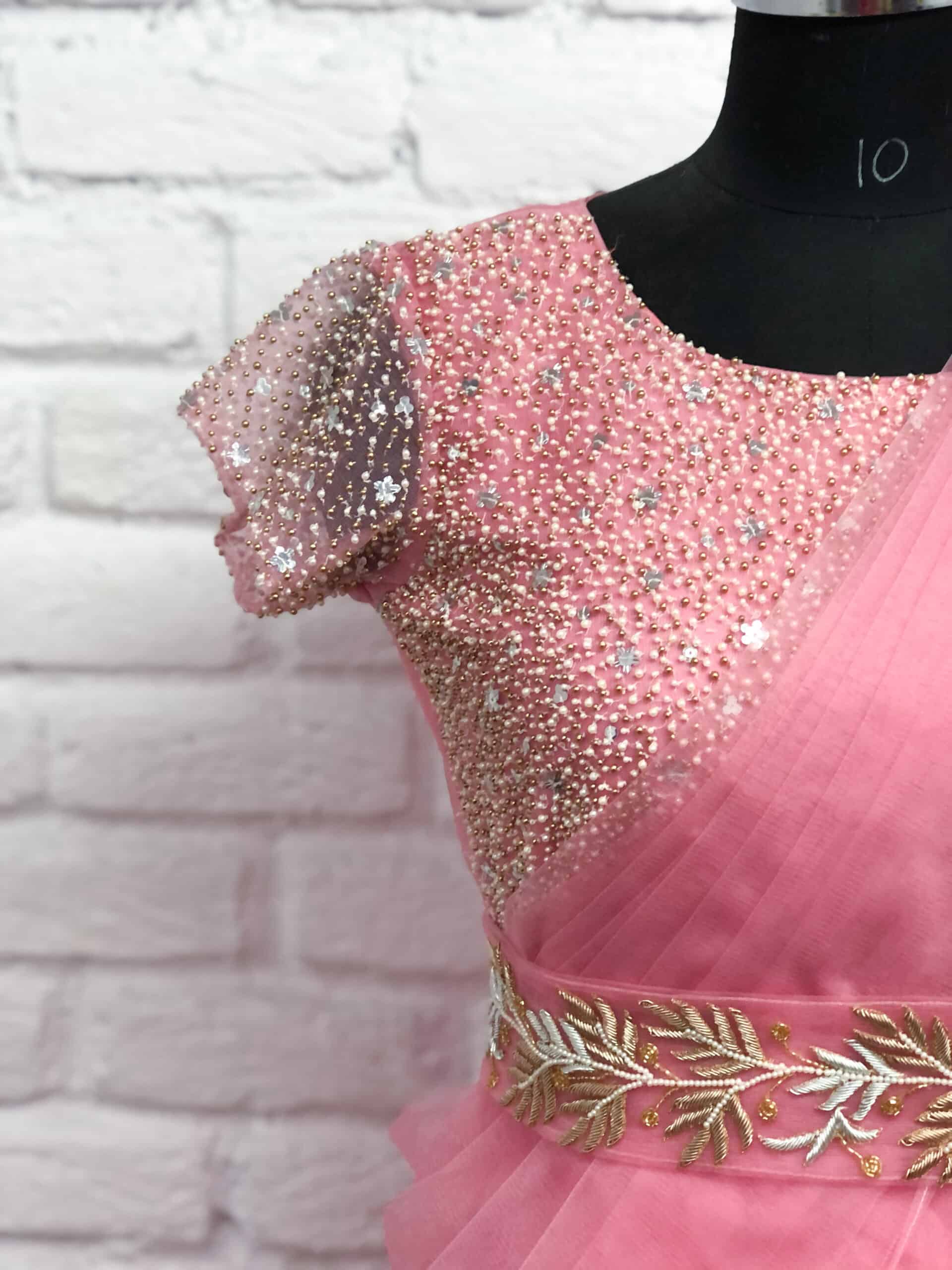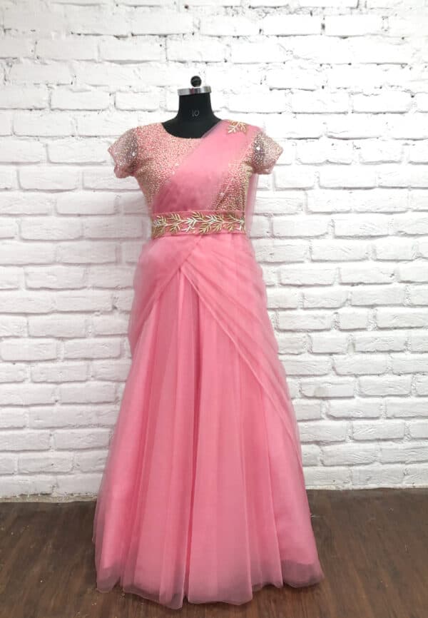 A pink gown with a pearl and bead-embellished bodice is sure to be a showstopper. The intricate detailing on the bodice would add a touch of elegance and sophistication. Pairing it with a draped dupatta will give the ensemble a graceful flow and an ethereal quality.