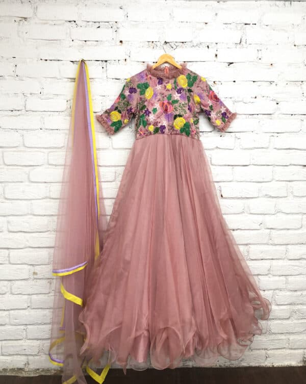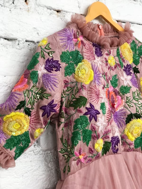 The combination of the soft nude organza with vibrant, multi-colored floral embroidery with beads and threads o bodice creates a look that’s both elegant and eye-catching.