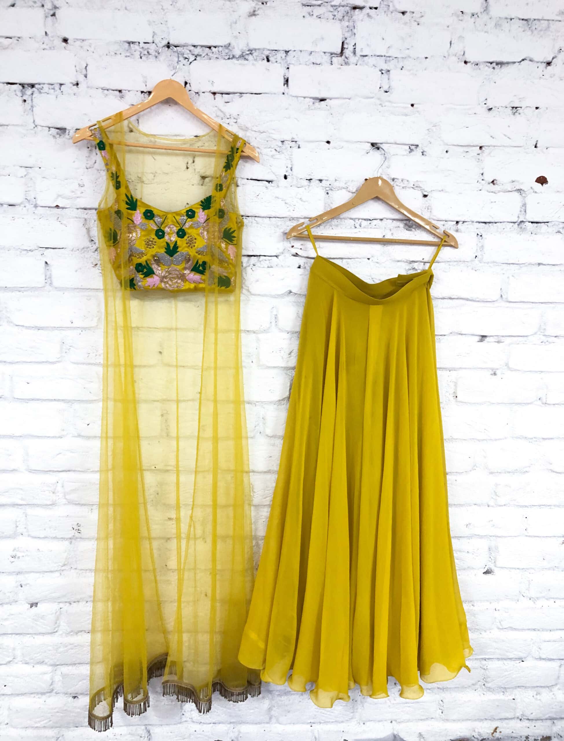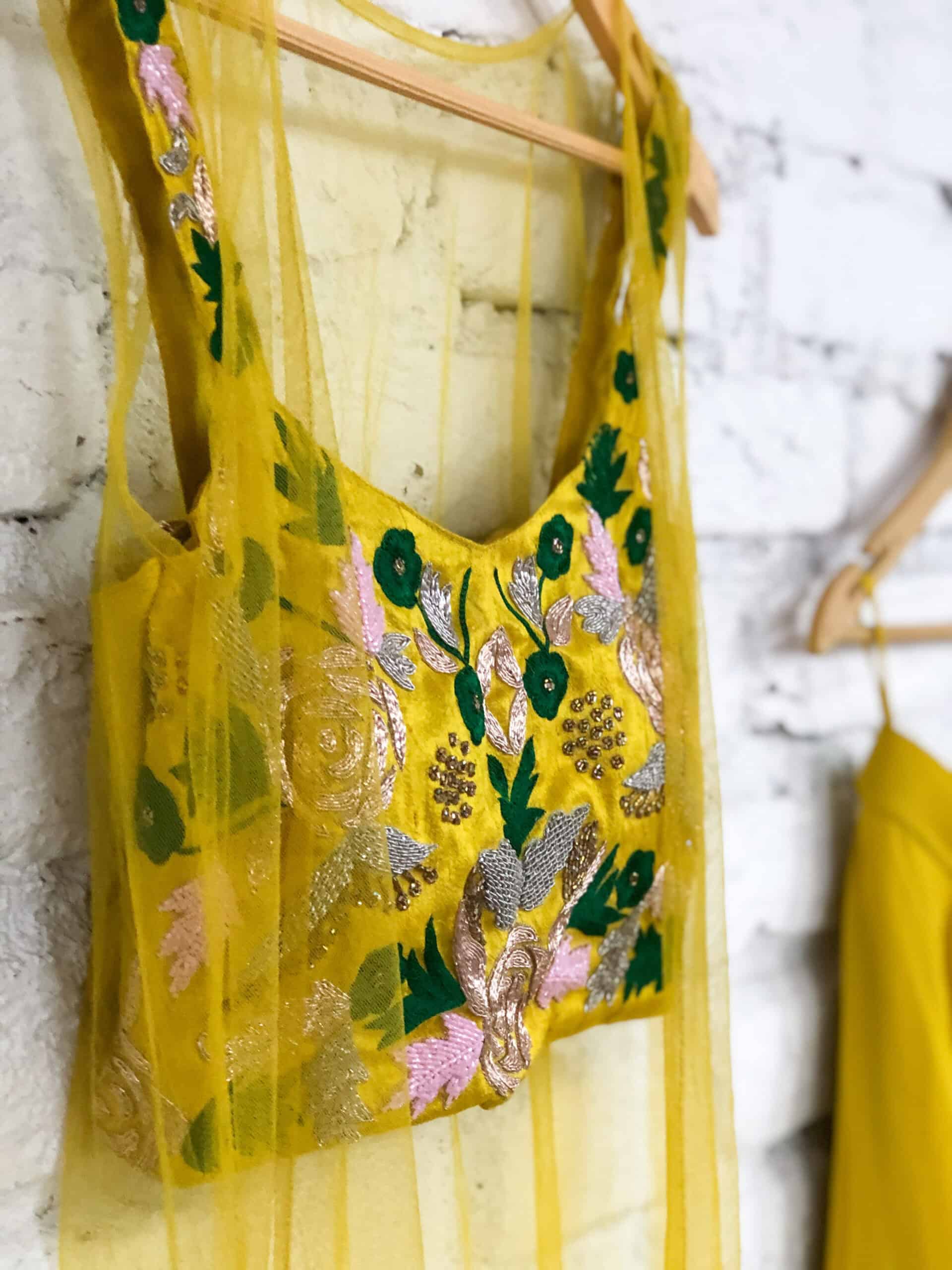 This lively ensemble features a stunning yellow palazzo paired with a beautifully embroidered blouse that radiates charm and elegance. The palazzo pants, with their soft, flowing fabric, offer a comfortable yet stylish silhouette, perfect for a variety of occasions.The blouse stands out with its colorful floral embroidery, which adds a touch of whimsy and sophistication