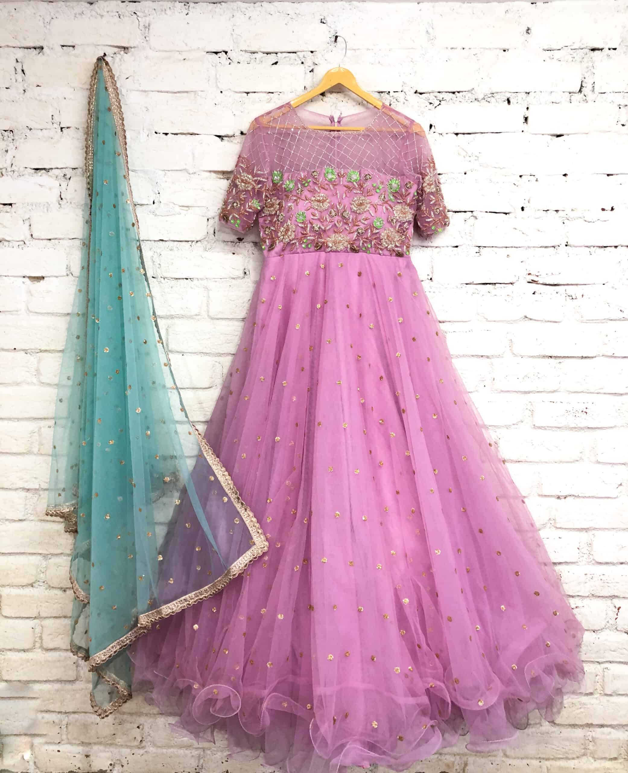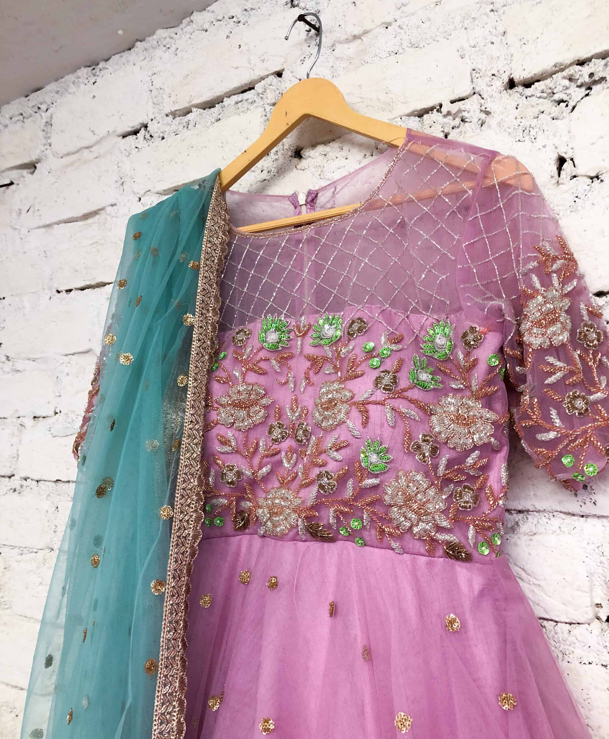 A lilac and mint green dress creates a beautifully refreshing and serene color palette. The intricate embroidery, delicately crafted design on the bodice adds timeless elegance to the dress (Can be customized as per your requirement.)