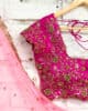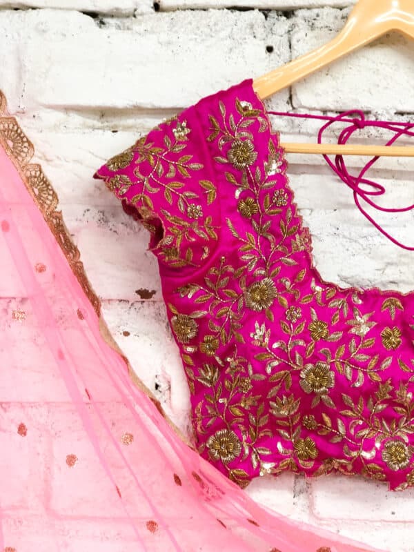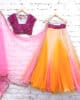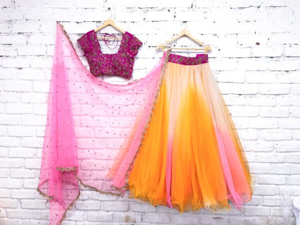 This stunning lehenga features a beautiful gradient of orange and pink, creating a vibrant and eye-catching look paired with pink blouse adorned with intricate antique zardozi work, the detailing adds a touch of opulence and traditional charm