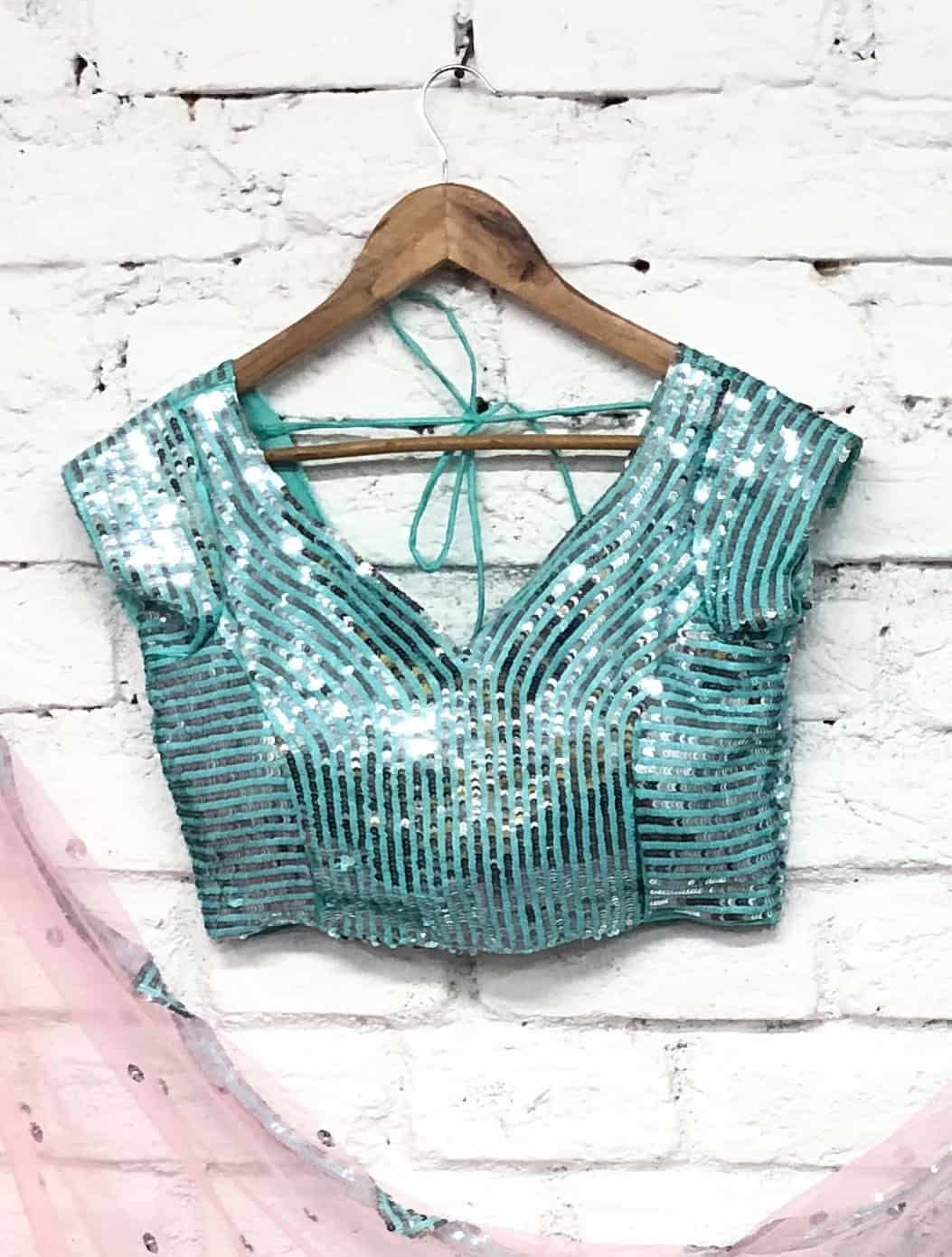This stunning blue lehenga is a perfect blend of elegance and glamour. The lehenga is adorned with intricate all-over sequin lines, creating a dazzling effect that catches the light with every movement. The sequins are meticulously placed, offering a shimmering, textured look that adds depth and sophistication to the rich blue fabric.The ensemble is beautifully complemented by a matching blouse, which features exquisite hand-sequined detailing.