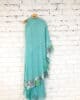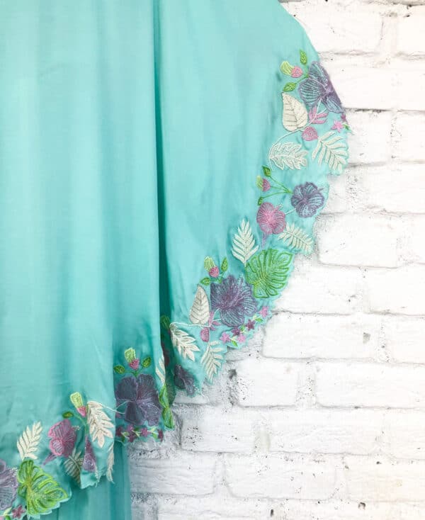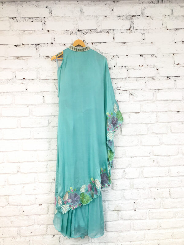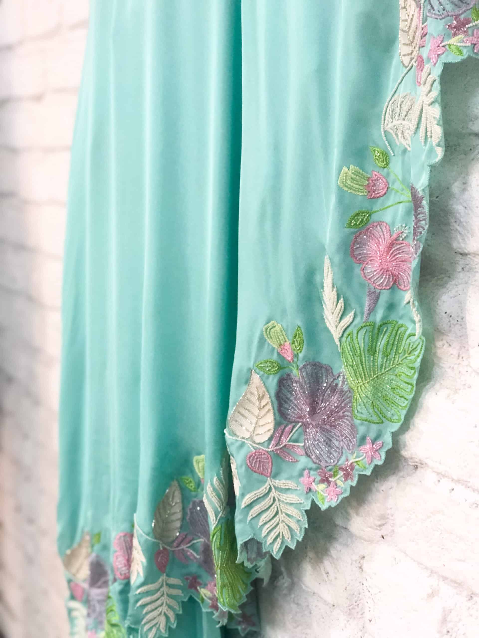 The blue floral embroidered draped dress is a masterpiece of modern couture, blending soft, flowing fabric with intricate floral patterns along the dress. (Can be customized as per your requirement.)