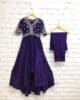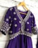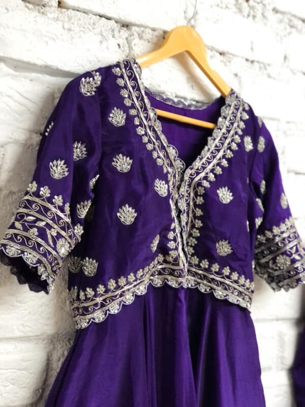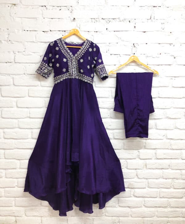 Purple dress paired with straight fit pant. The combination of silver and purple creates a harmonious contrast that enhances the gown’s visual impact. Silver accents of the zardozi embroidery against the deep hues of purple create a regal and luxurious aesthetic. This color pairing is both timeless and sophisticated, making it ideal for capturing attention at formal events and celebrations.