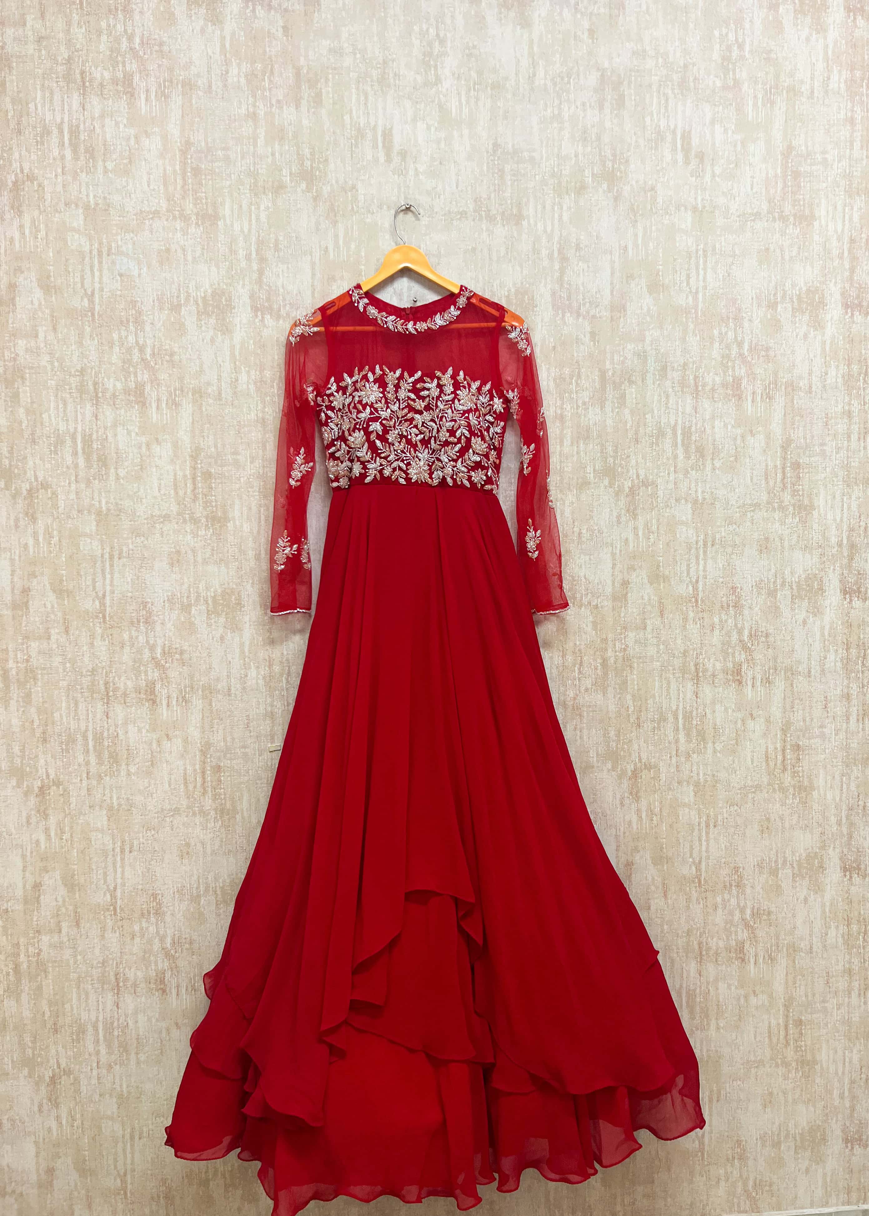 This stunning red gown features a floor-length, layered skirt with a sheer, full-sleeved bodice beautifully highlighted by intricate white floral embroidery. The design seamlessly blends elegance and contemporary fashion, making it perfect for formal occasions and celebrations. The gown radiates grace with its flowy silhouette, delicate net sleeves, and sophisticated detailing.