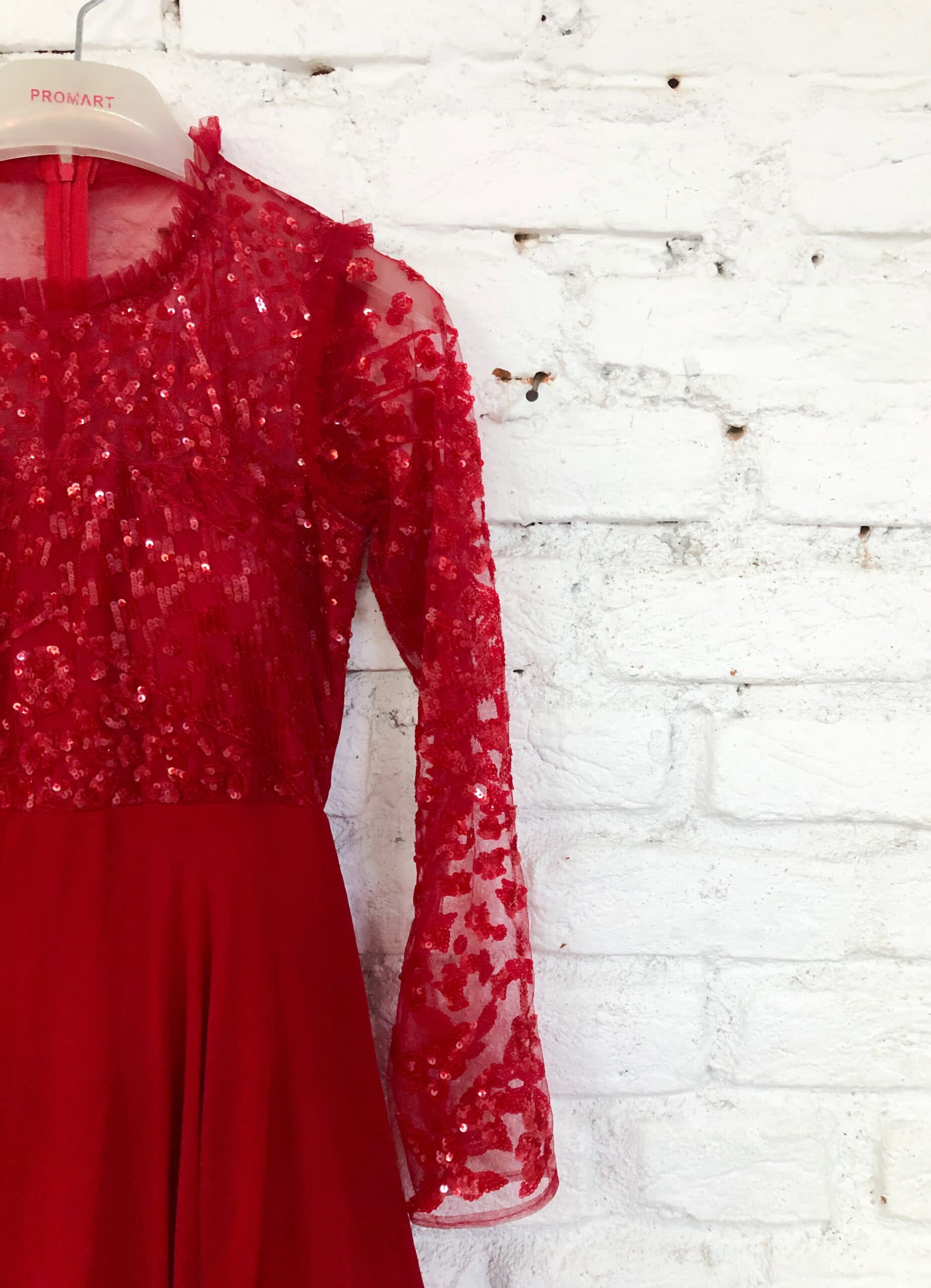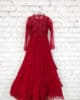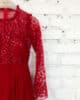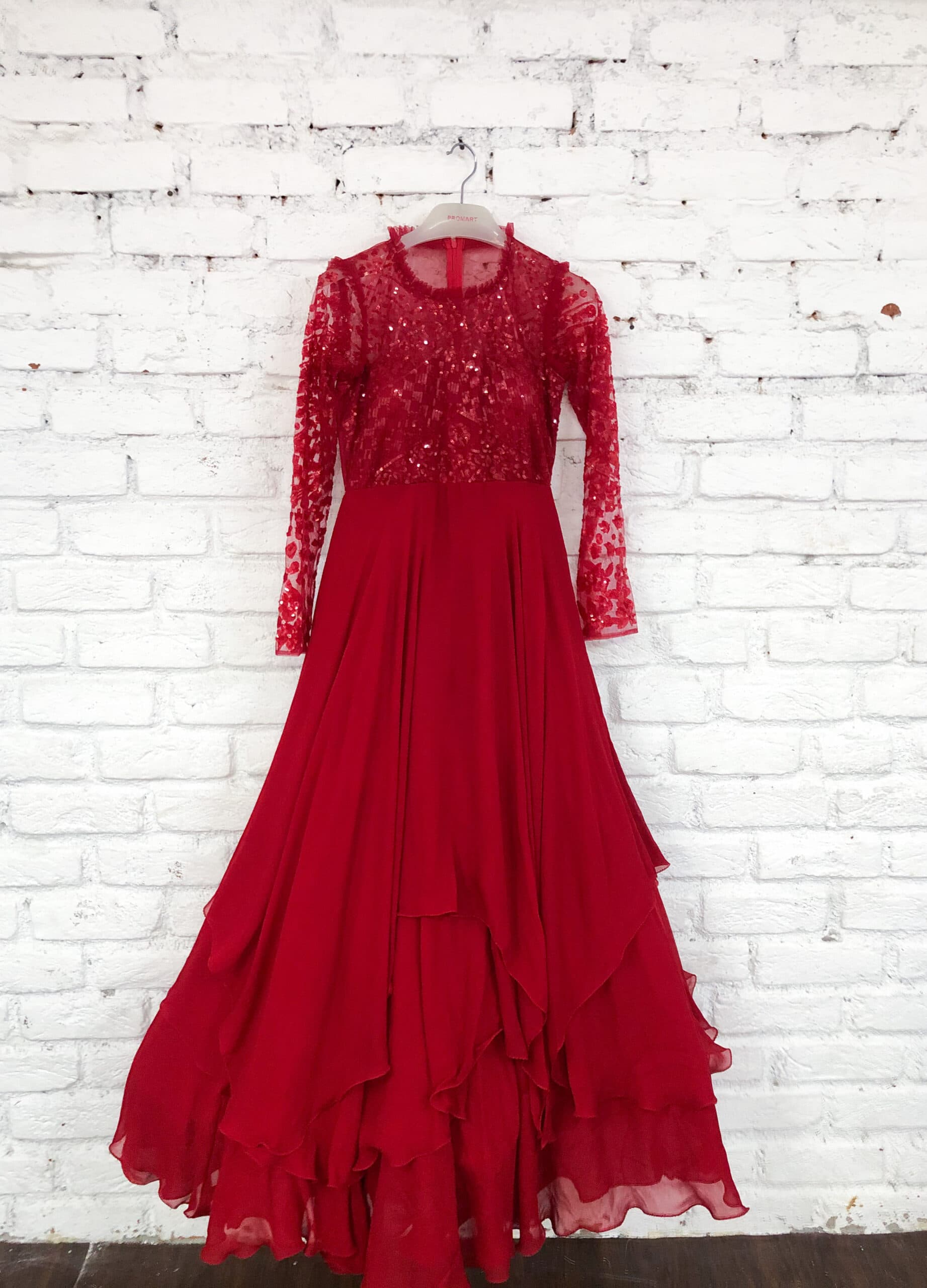 The red sequined embroidered bodice with a three layered gorgortte gown is a dazzling fusion of intricate craftsmanship and flowing elegance. This ensemble captures attention with its rich color and sparkling embellishments, making it a standout choice for formal events and special occasions.