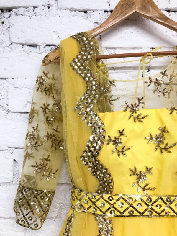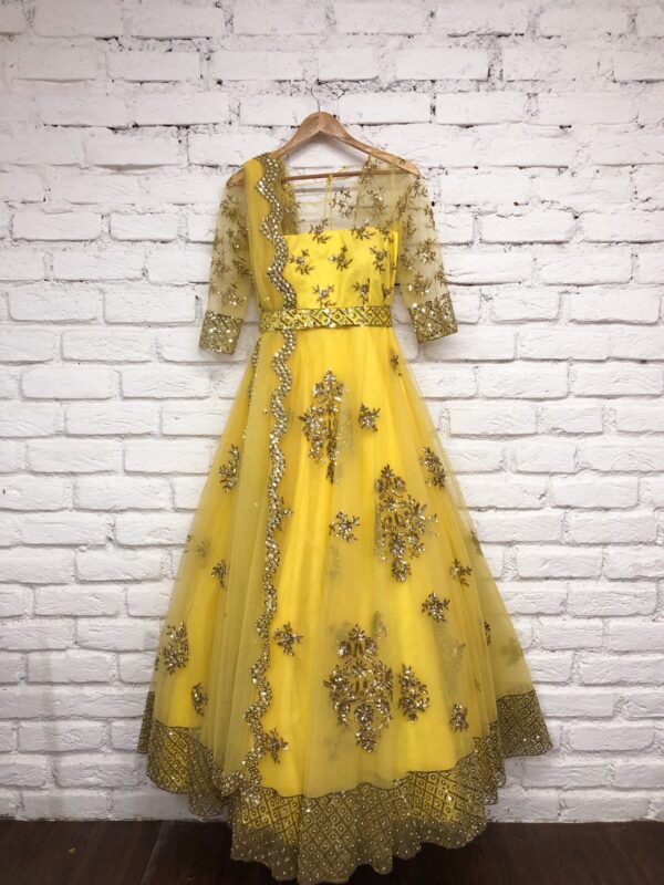 A stunning yellow gown intricately adorned wih hand emnroidery, exuding elegance and craftsmanship.(Can be customized as per your requirement.)
