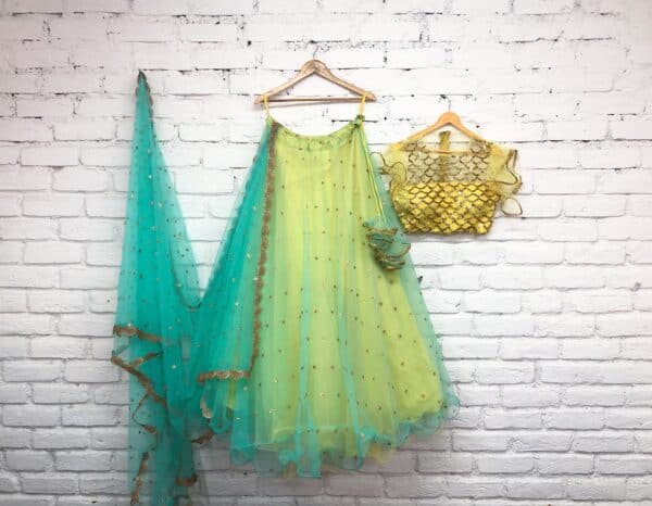 This dual-shaded net lehenga is a stunning combination of elegance and modernity. The intricate handwork on the blouse perfectly complements the lehenga, showcasing exquisite craftsmanship and attention to detail.