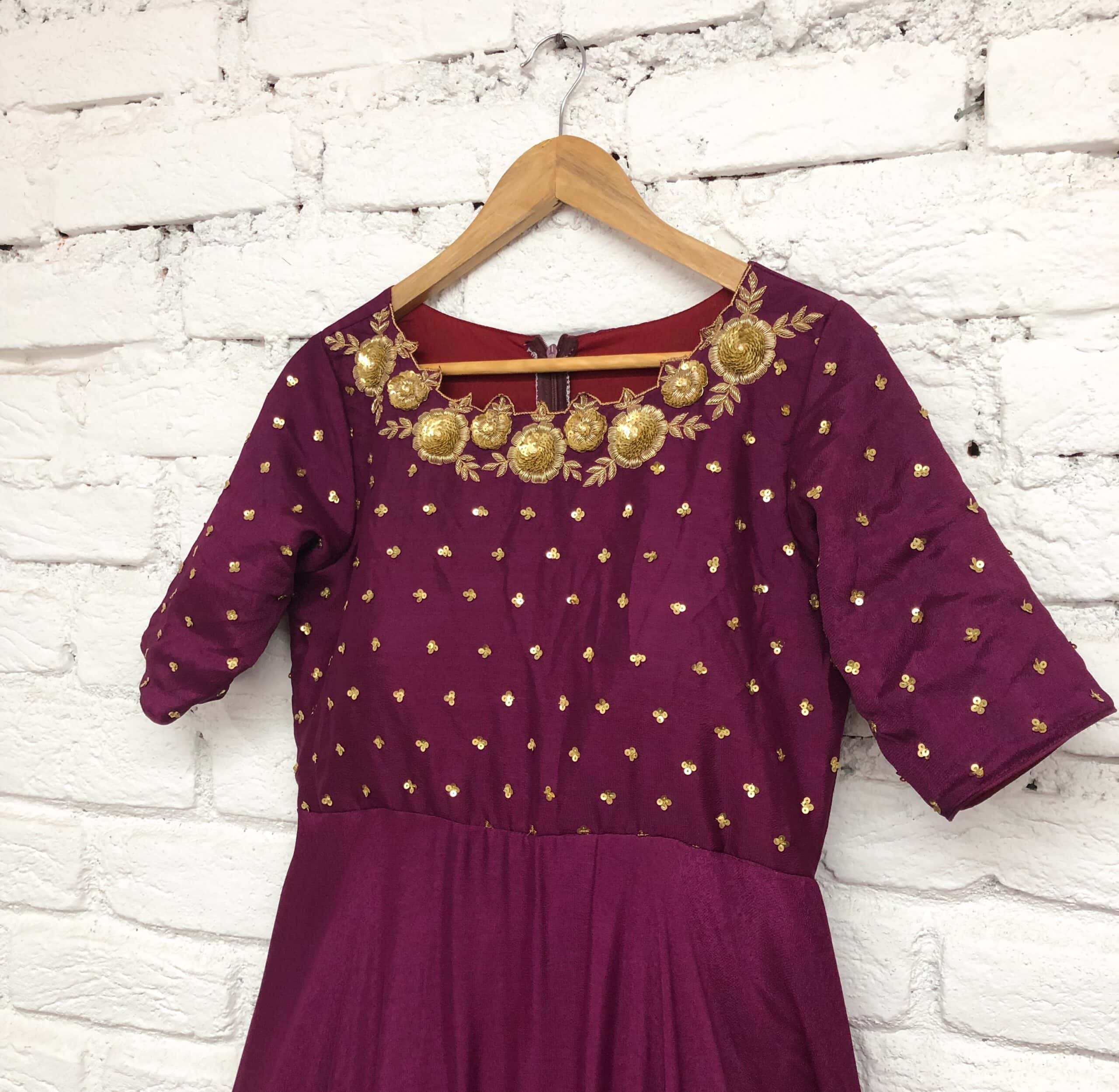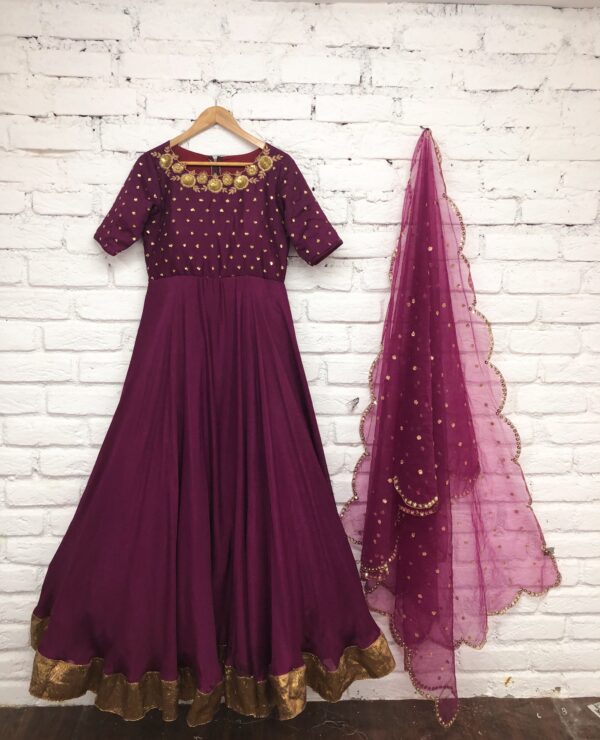 Wine gown with hand work bodice with lampi border paired with hamnd embroided dupatta(Can be customized as per your requirement.)